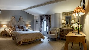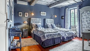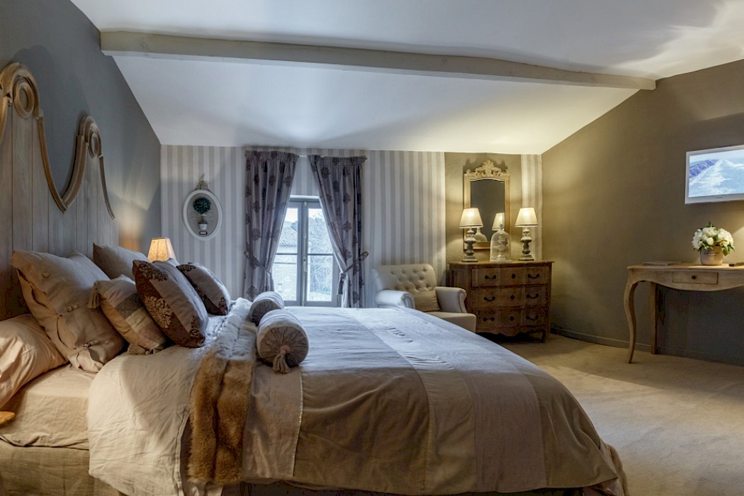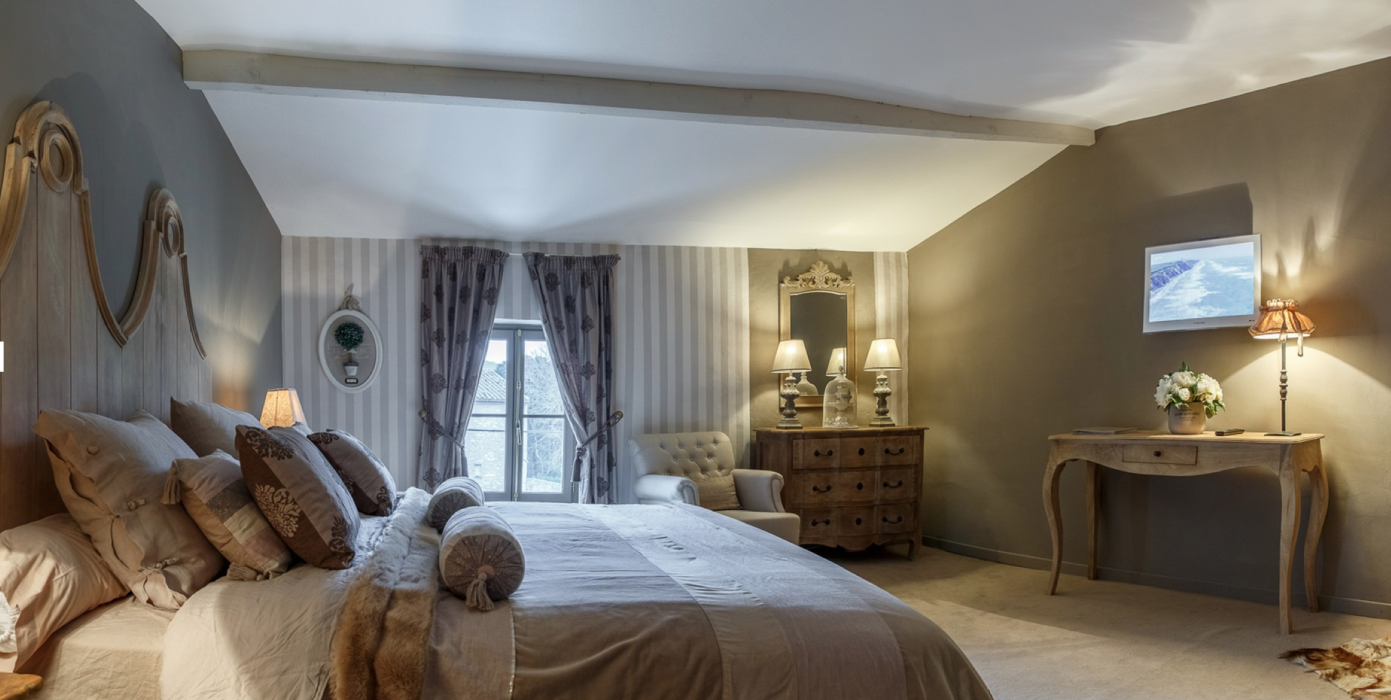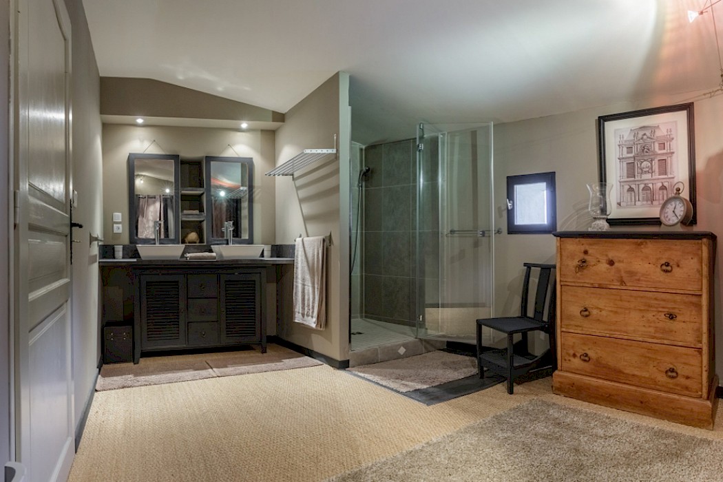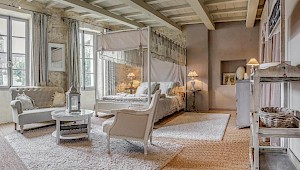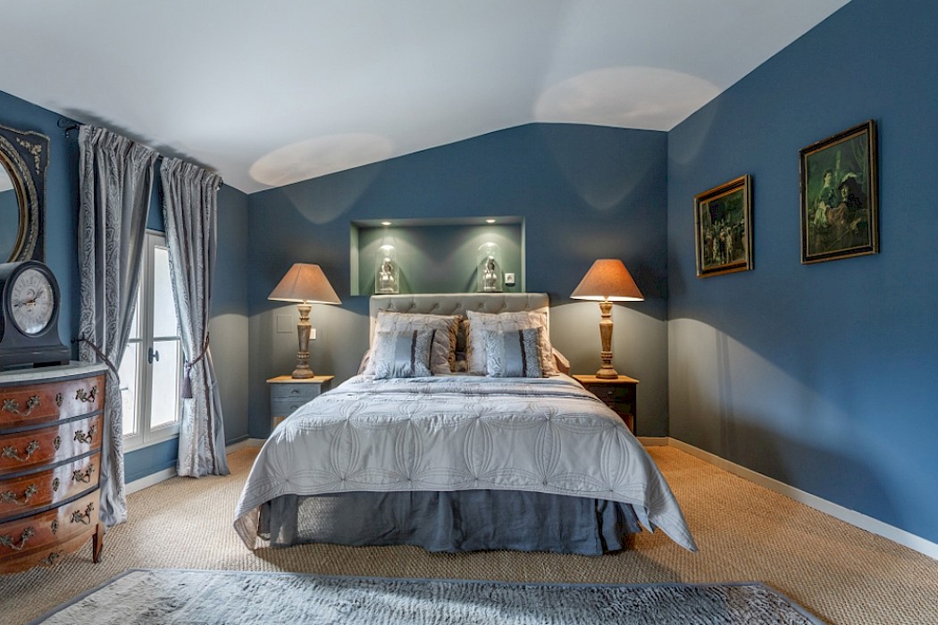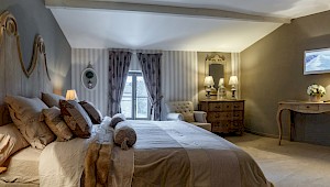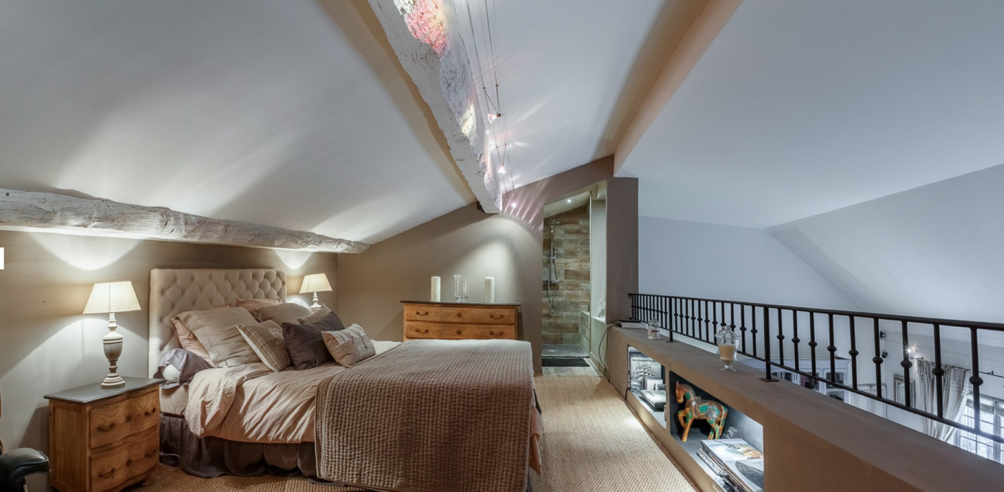 The elegant villa is reached through a secluded courtyard. At ground level there is a cosy lounge with a beamed ceiling and a fireplace, a spacious dining room and a well-equipped kitchen. A mezzanine bedroom overlooks the living room, which itself opens onto a terrace that is ideal for al fresco meals.