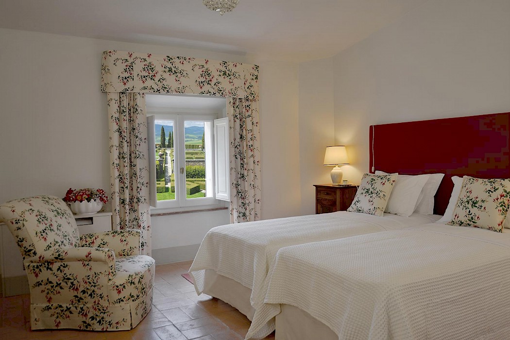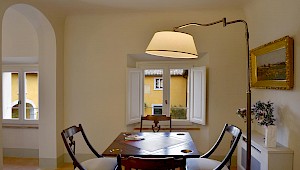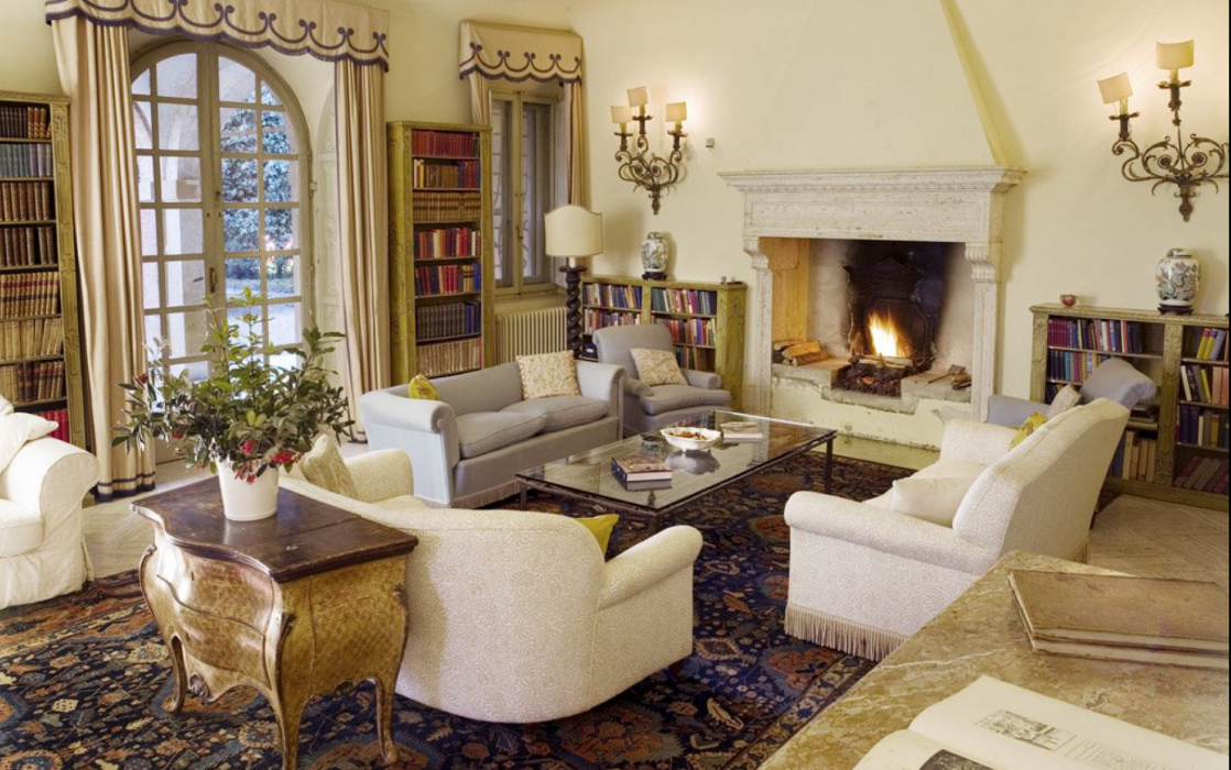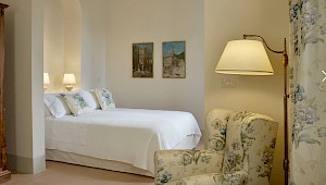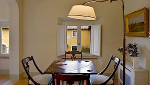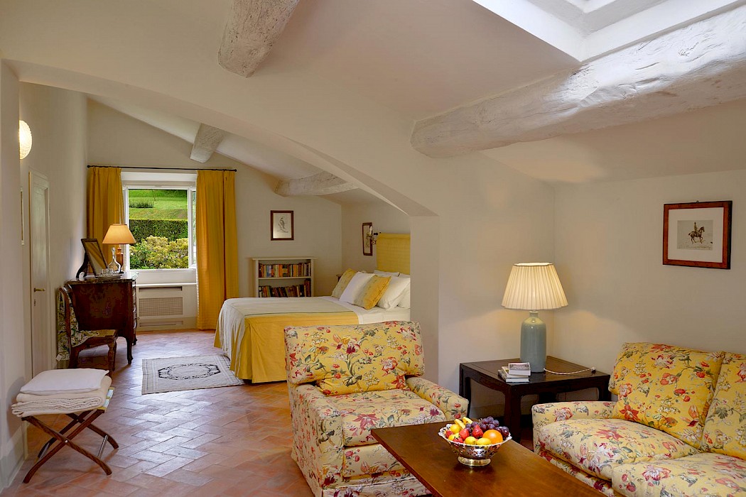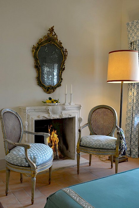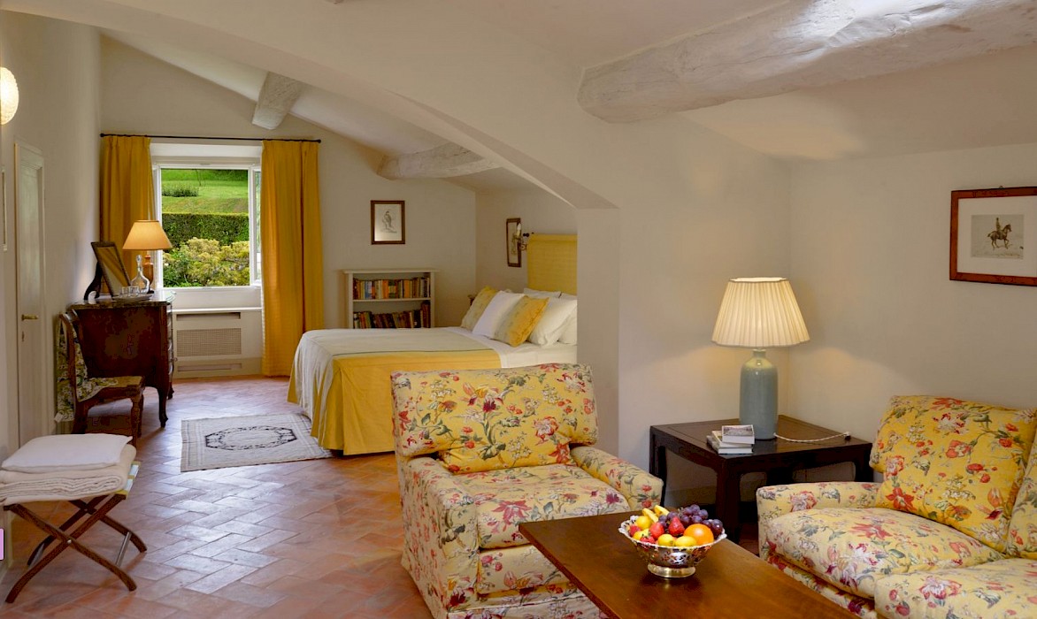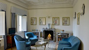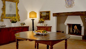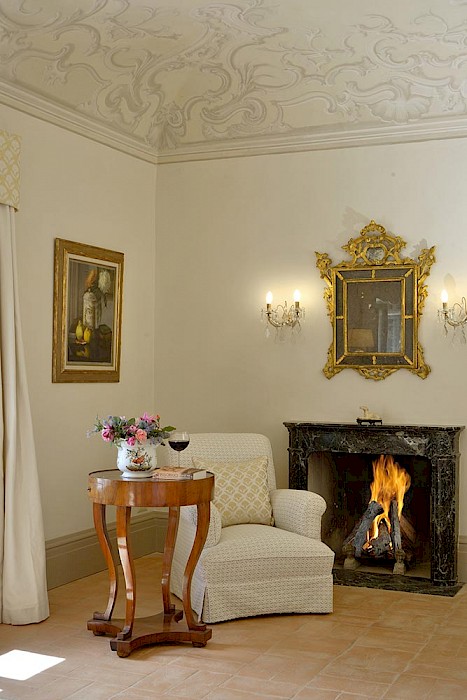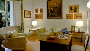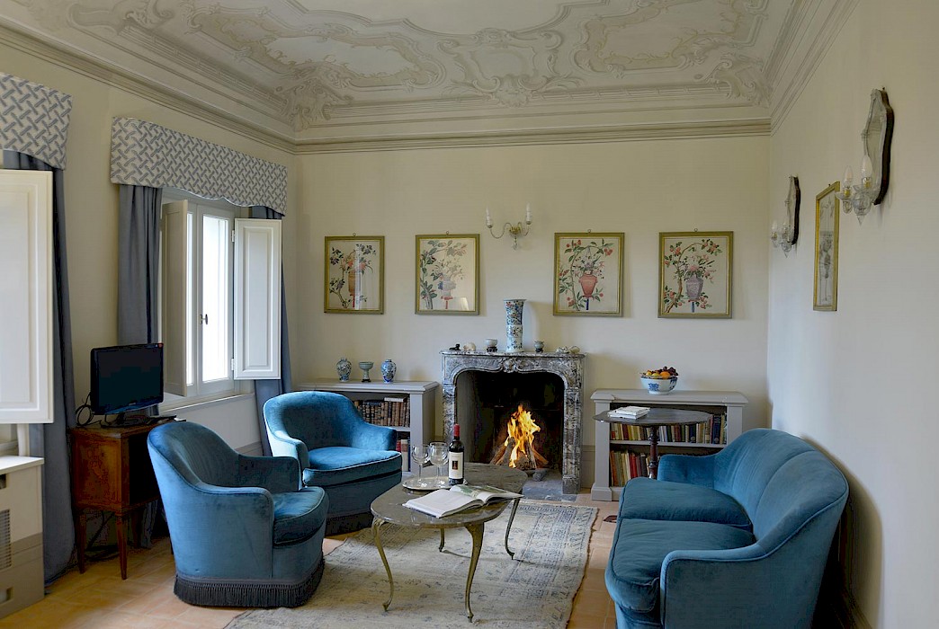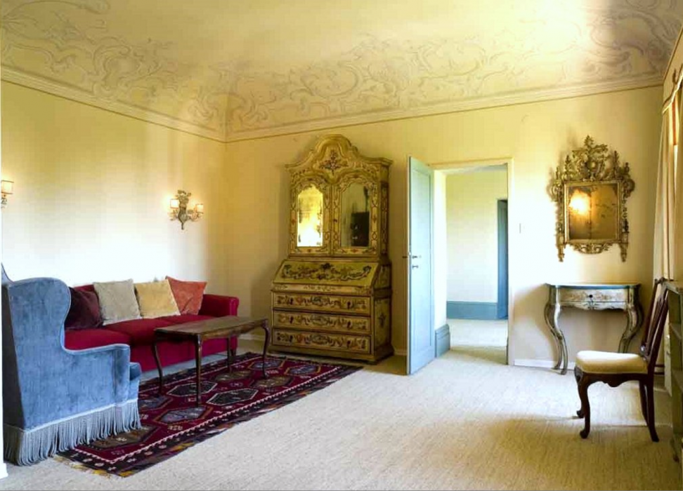 There is a delightful library with fireplace and sofas, a central frescoed and balconied dining room for very special evenings, a second dining room closer to the kitchen (accessible only by La Foce staff), a breakfast room with double glass doors facing the private 'fountain' garden, and a study. An ample music room and living room, with fireplace and many comfortable sofas and armchairs, offers great opportunities for entertaining friends and family gatherings.