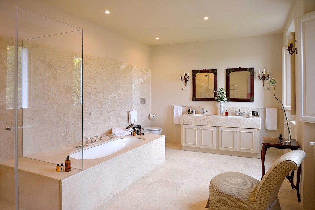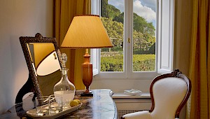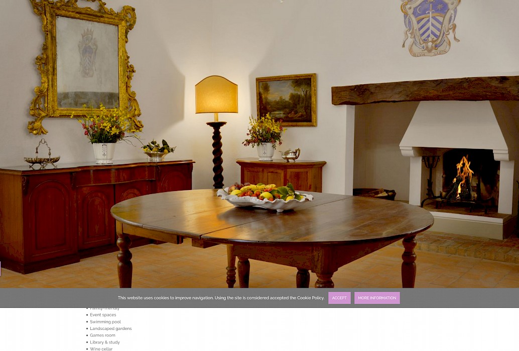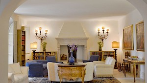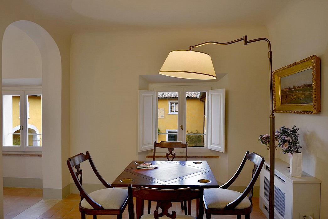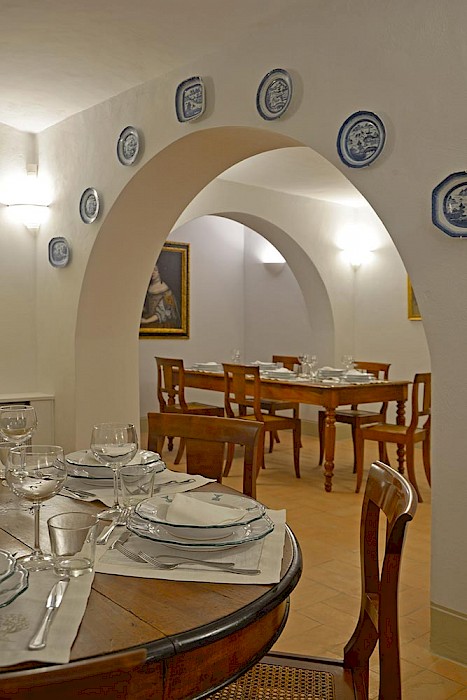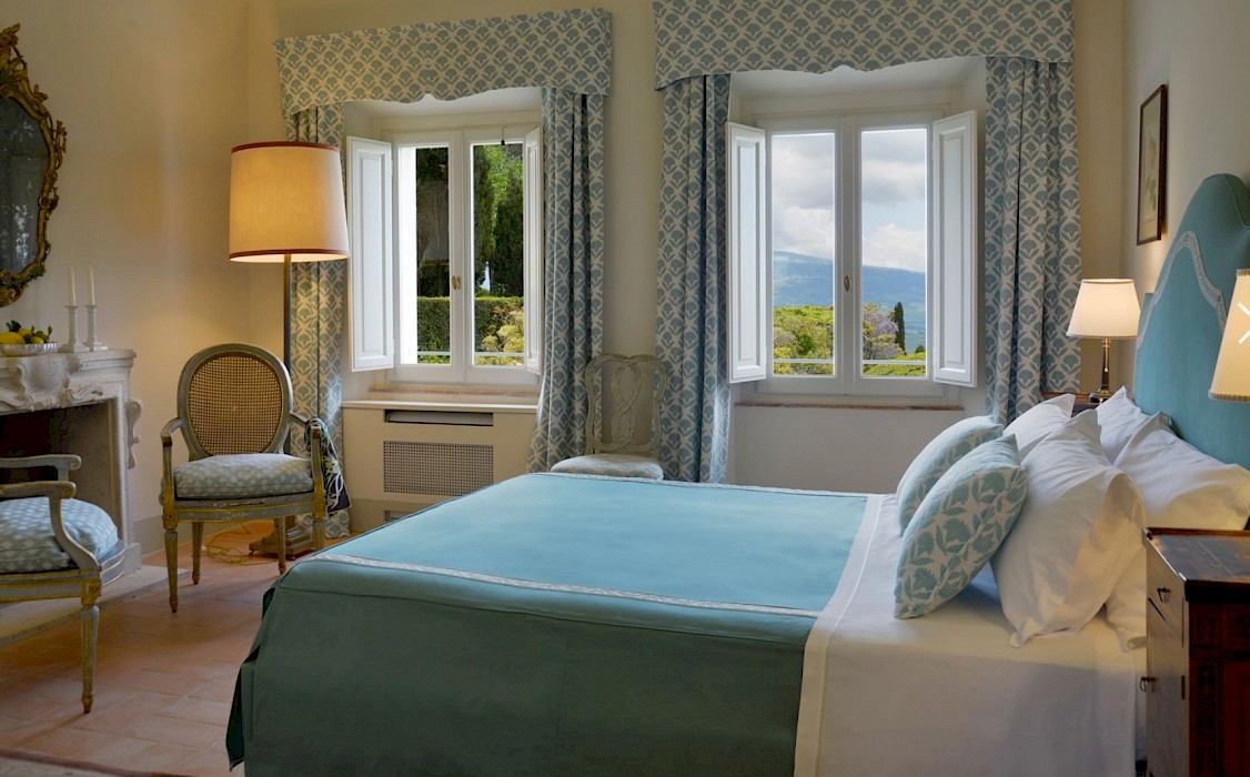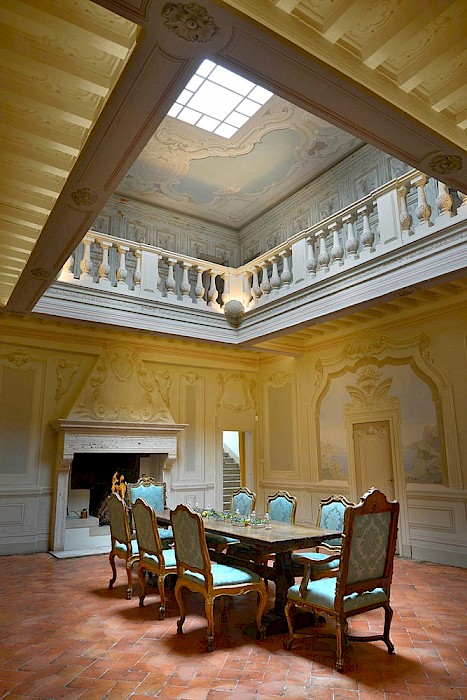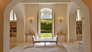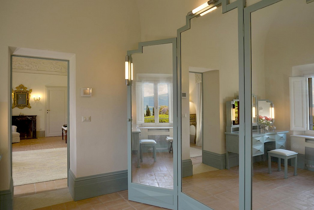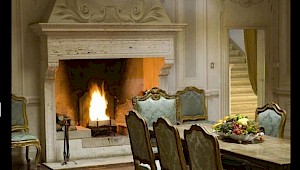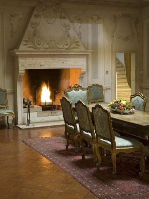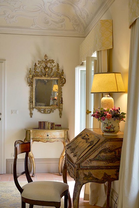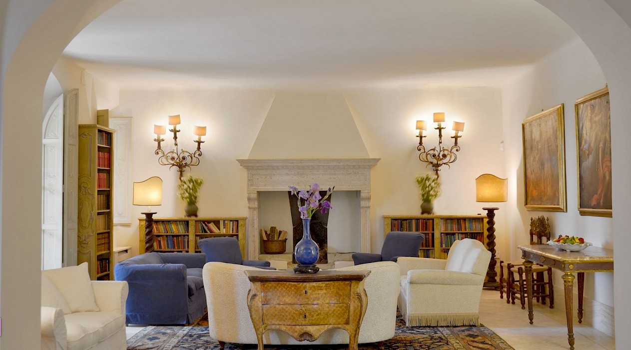 There is a delightful library with fireplace and sofas, a central frescoed and balconied dining room for very special evenings, a second dining room closer to the kitchen (accessible only by La Foce staff), a breakfast room with double glass doors facing the private 'fountain' garden, and a study. An ample music room and living room, with fireplace and many comfortable sofas and armchairs, offers great opportunities for entertaining friends and family gatherings.