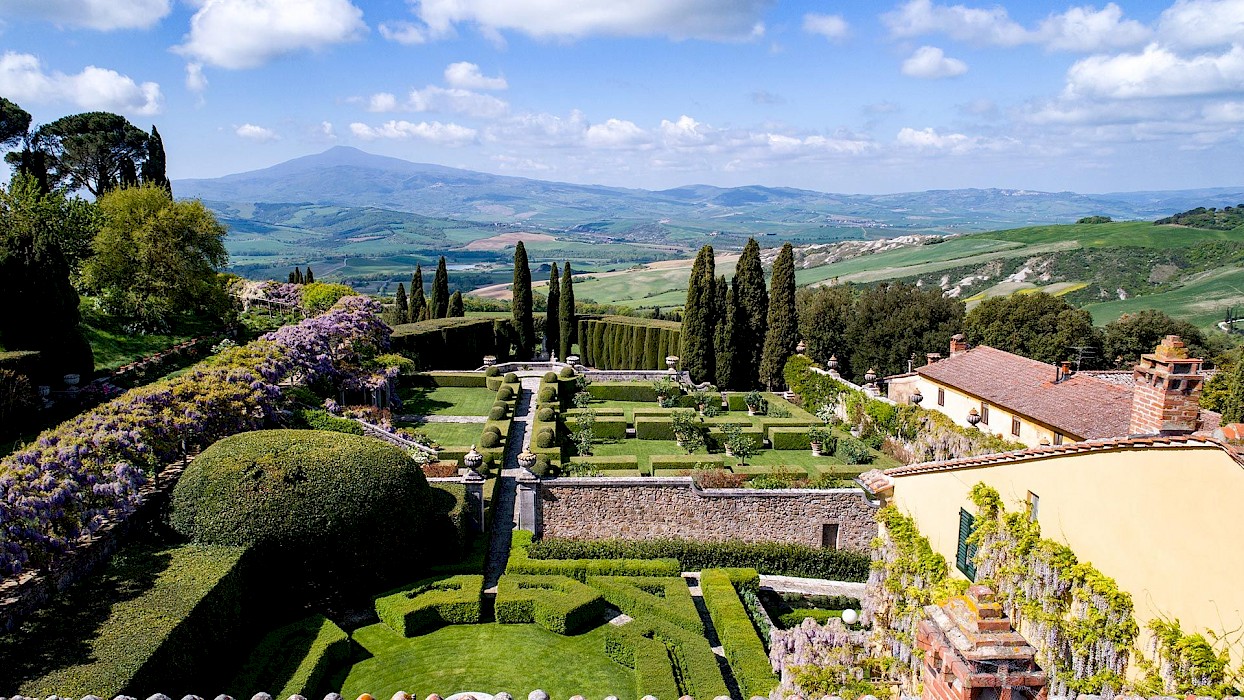 An Opportunity to live in an authentic, aristocratic villa on a still functioning estate,surrounded by some of the most beautiful formal gardens in Italy, and with views of the magnificent Val d'Orcia.